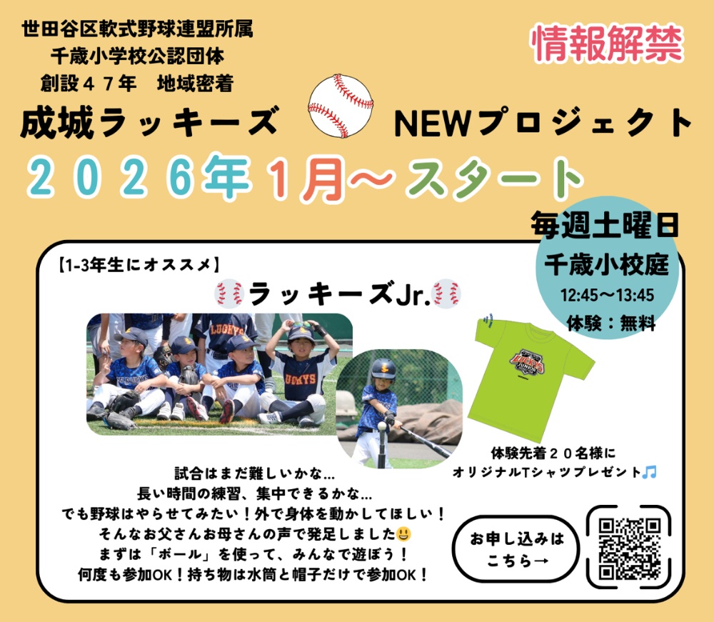| 対象年齢 | 幼児(年長)〜小学3年生 野球未経験者や試合はまだ難しい、長い時間の練習が不安。でも野球をやってみたい、外で身体を動かしたい方、大歓迎です。 |