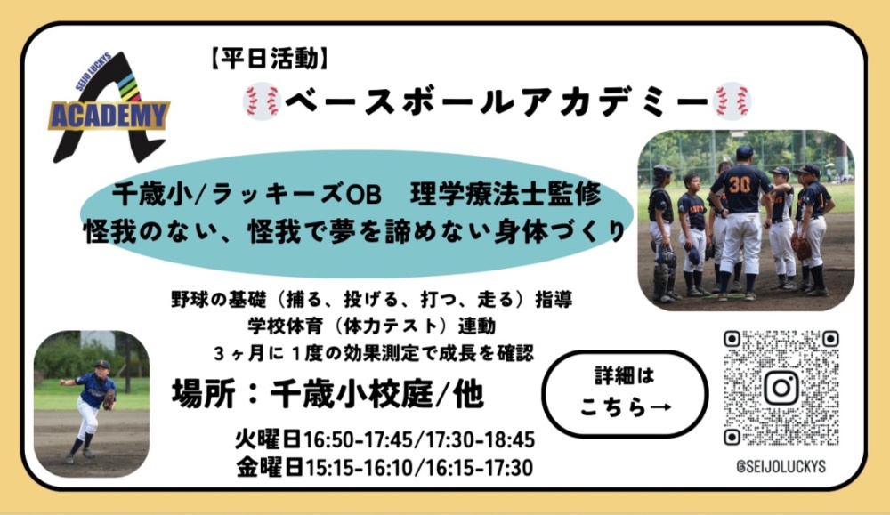 | クラス | 『ルーキークラス』 対象年齢:幼児〜小学2、3年生(低学年、野球未経験者向け) 『マイナークラス』 対象年齢:小学3年生〜小学6年生(低学年野球経験者、高学年向け) 『メジャークラス』春頃開始予定 |
